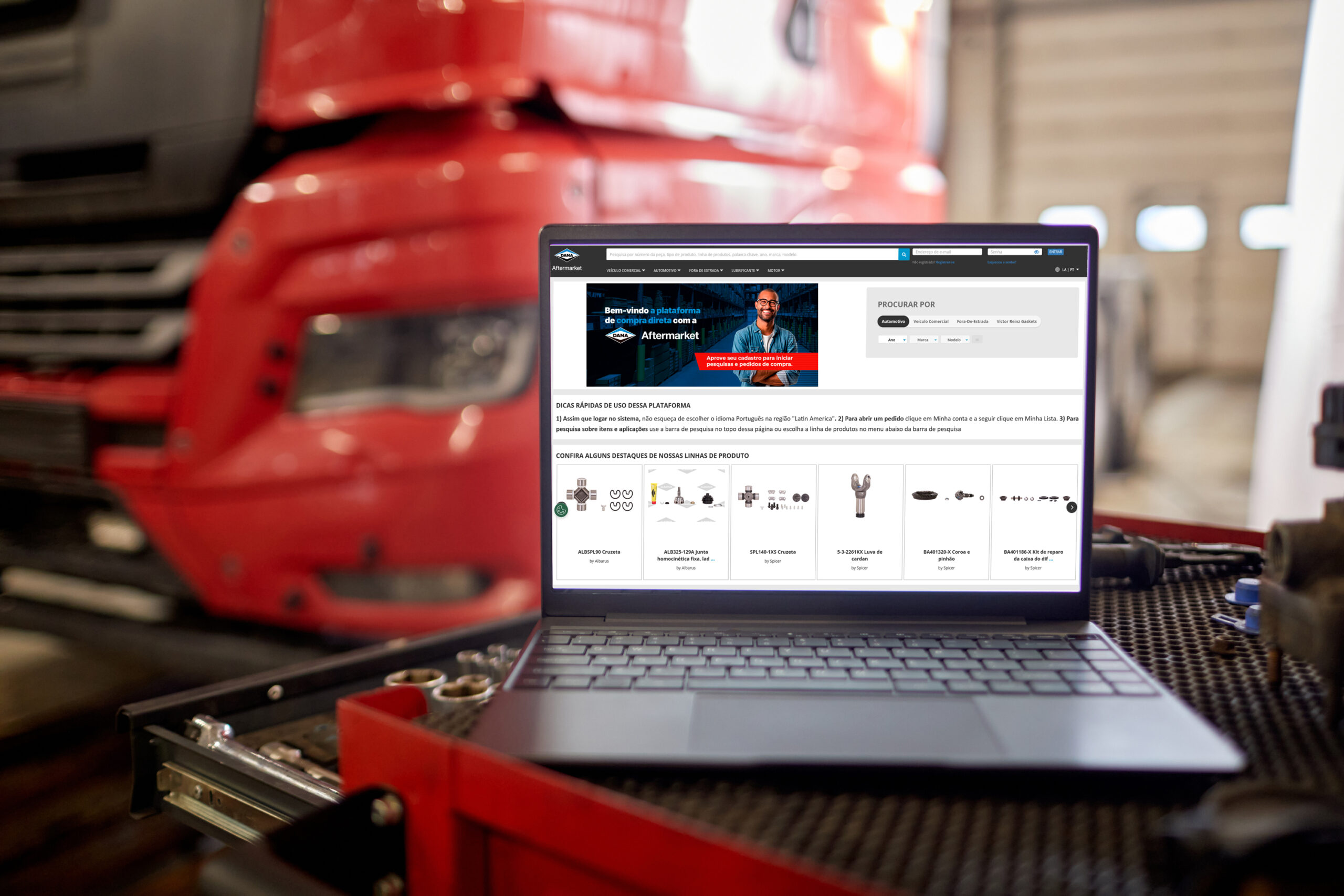 O DanaAftermarket.com é o canal oficial para pedidos de todos os produtos disponíveis para o mercado de reposição das marcas Spicer, Spicer Select, Victor Reinz e Albarus. A plataforma garante acesso rápido às linhas disponíveis, agilizando o processo desde a seleção da peça até a consulta de estoque disponível, com ferramentas que permitem acompanhar pedidos, reimprimir faturas, verificar créditos e consultar preços e dados comerciais.